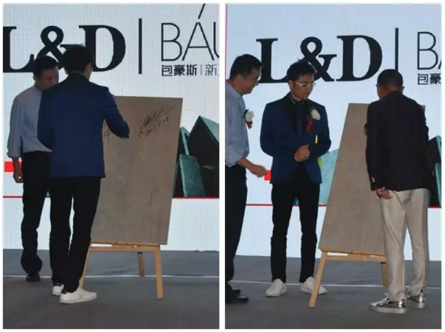 在新品发布的环节,由覃思先生、陈方晓先生,唯美L&D陶瓷事业部市场总监陆新华先生以及呼和浩特唯美L&D陶瓷总经理王伟先生为新品进行了揭幕仪式,覃思先生和陈方晓先生在新品上签字留念。全场的设计师朋友们共同见证了这意义非凡的一刻,使得唯美L&D陶瓷2017年新品在本次活动上大放异彩。
